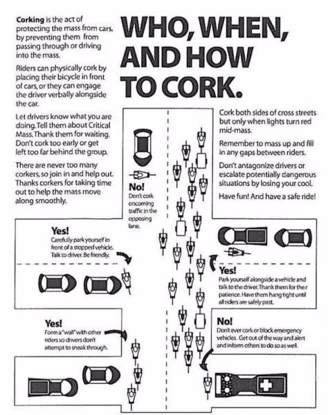 La Critical Mass se déplace sans leader. Le parcours est aléatoire, si vous vous trouvez devant, vous avez la chance de déterminer par où on passe. Comme la Masse Critique se déroule sans itinéraire officiel, les participant·es pratiquent une tactique connue sous le nom de « corking » (bouchage) afin de maintenir la cohésion du groupe. Cette tactique consiste à bloquer la circulation sur les routes secondaires afin que la masse puisse passer les feux rouges sans interruption. Le « corking » permet à la masse de s’engager dans une variété d’activités, telles que tourner en rond dans une intersection, ou soulever leurs vélos dans une tradition connue sous le nom de « Chicago hold-up » (hold-up de Chicago). Les « Corks » profitent parfois de leur temps de bouchage pour distribuer des tracts.
