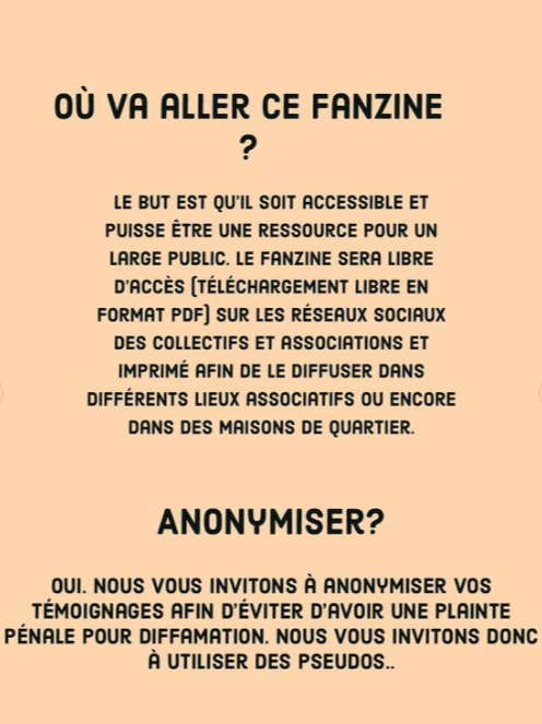A travers ce fanzine, nous proposons de nous réapproprier nos récits. De libérer la parole. Que la honte change de camp. Les voix des noirexs comptent.